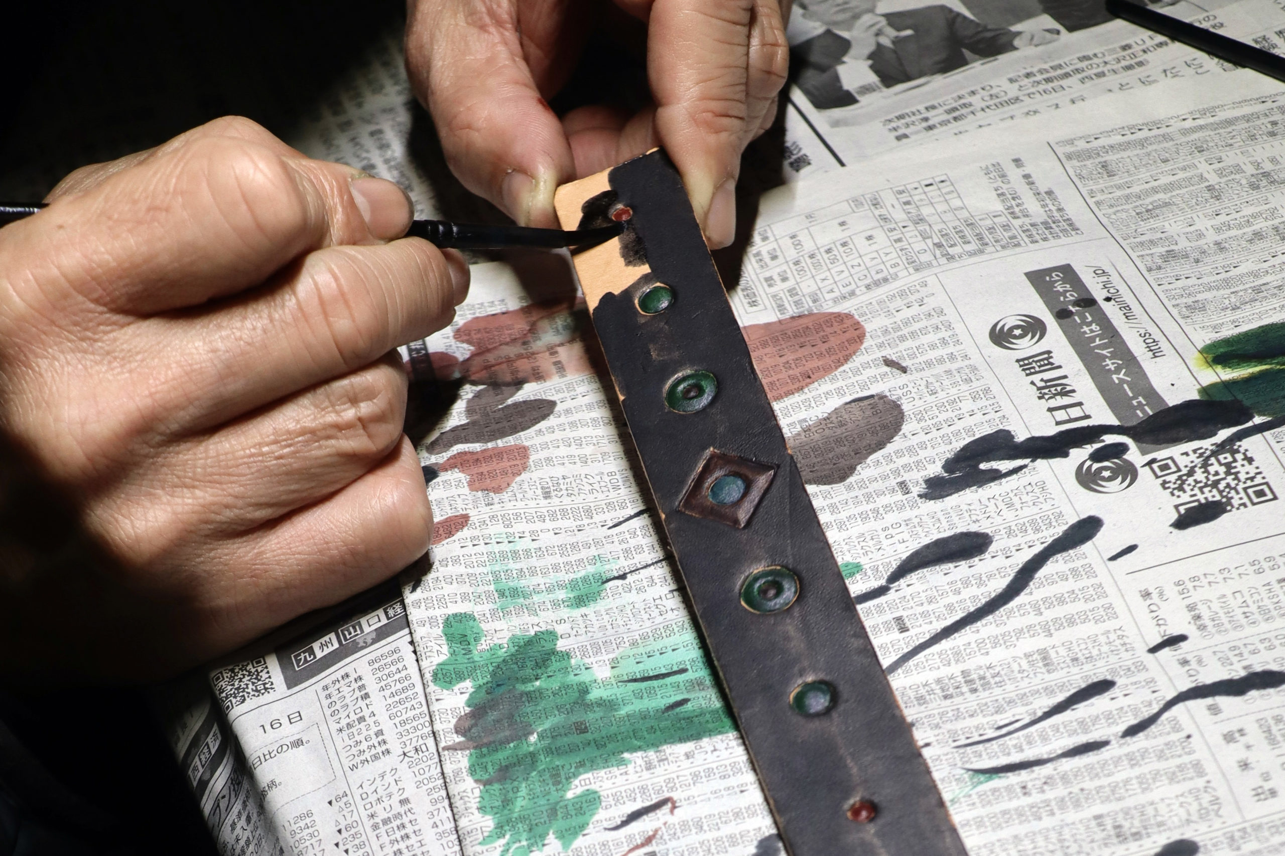 革を叩いて彫刻し、染色し、断面を丁寧に磨き、