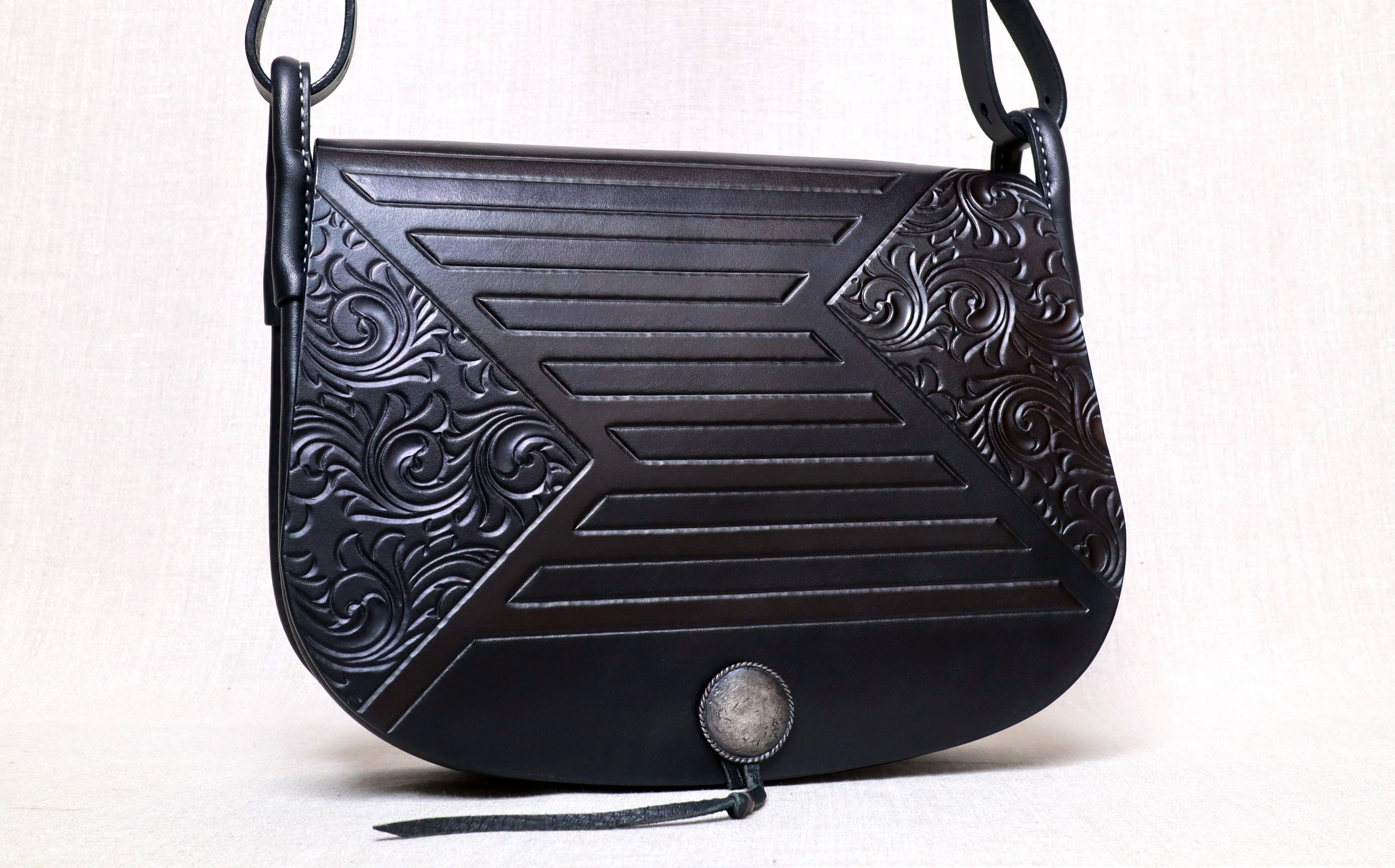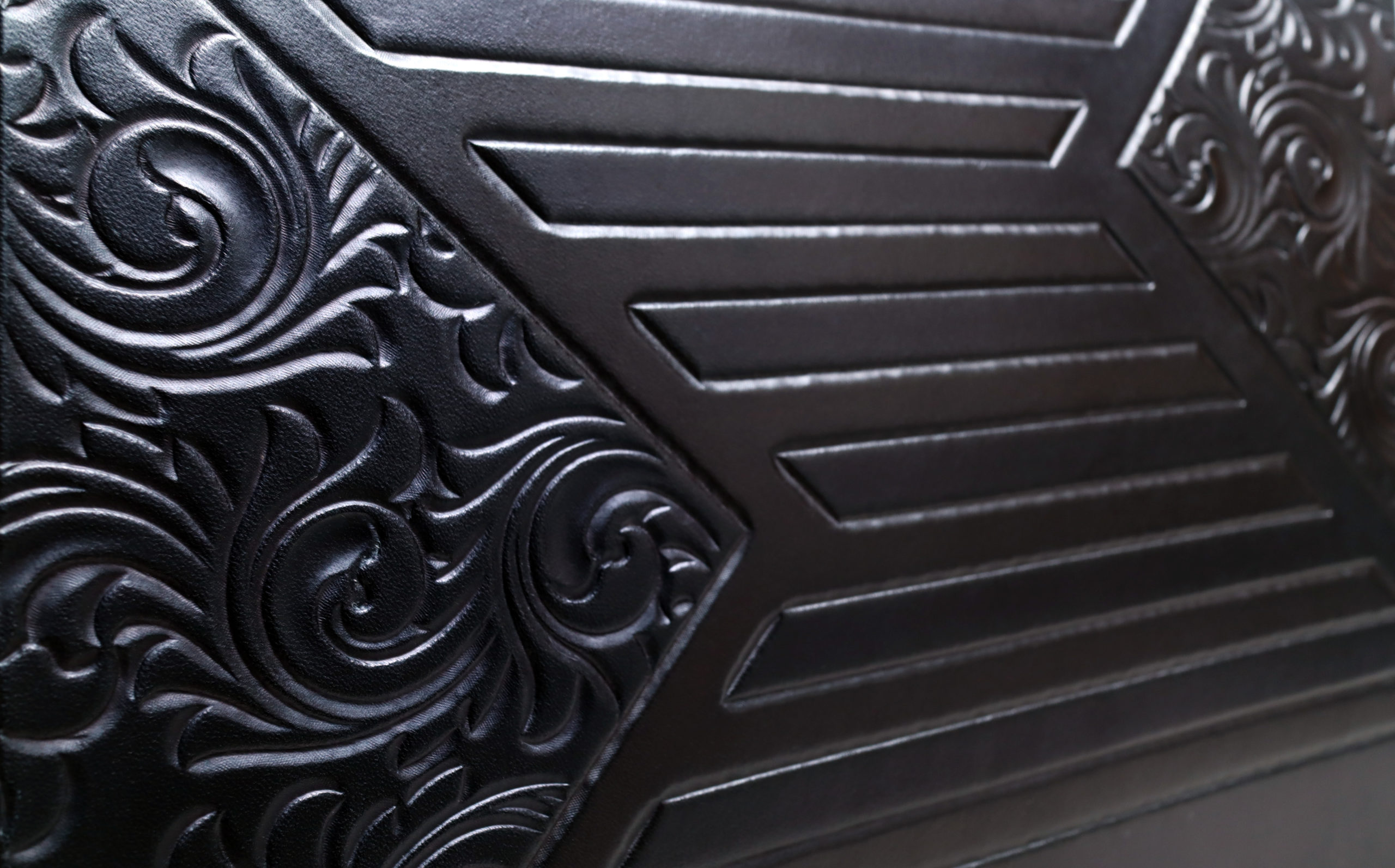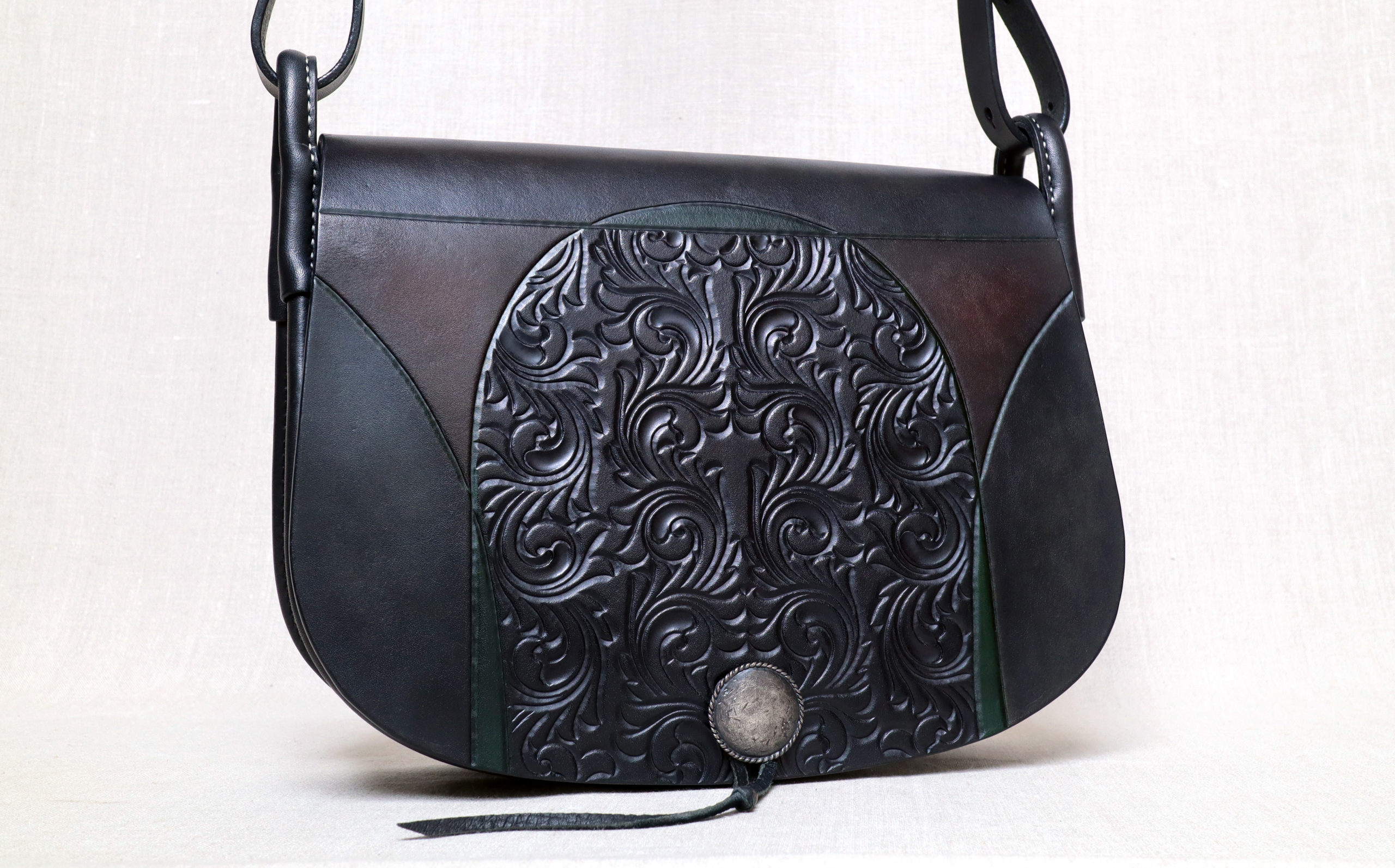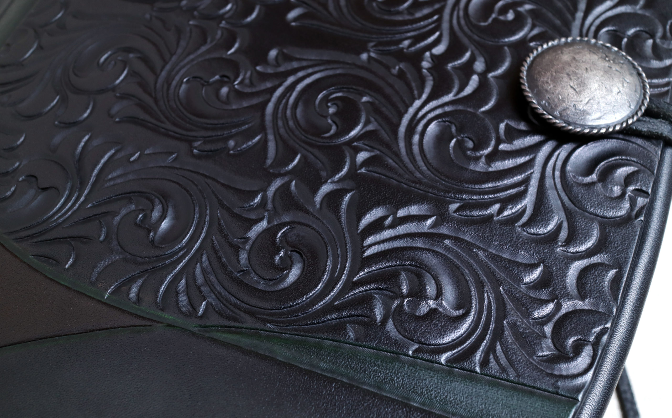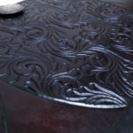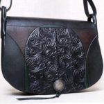 私は、独自に探求してきた彫刻や染色の技を用いて、単なる装飾を超えるような芸術表現を革製品にほどこし、工芸美と芸術性をあわせもつ作品を生み出したいという想いで、創作活動に取り組んでいます。