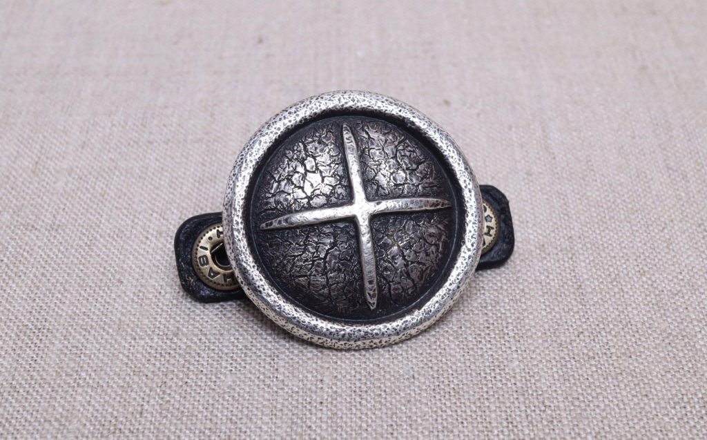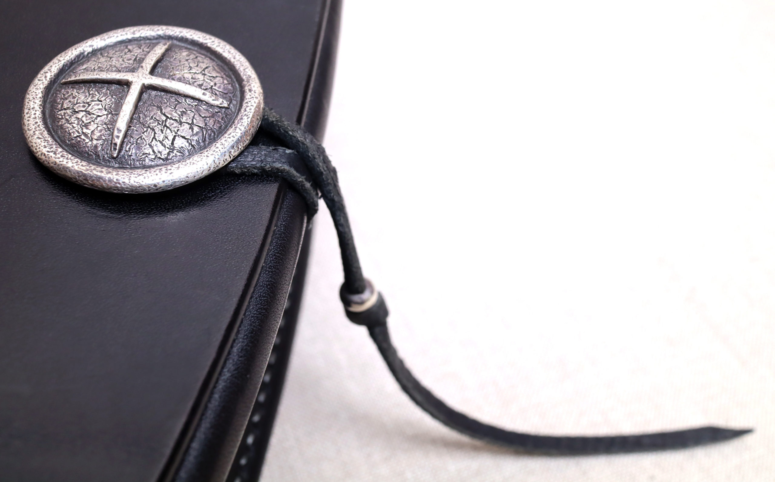 SILVER OBJECTに、鹿革紐(シルバービーズ付き)を巻き付けてフラップを留めます。