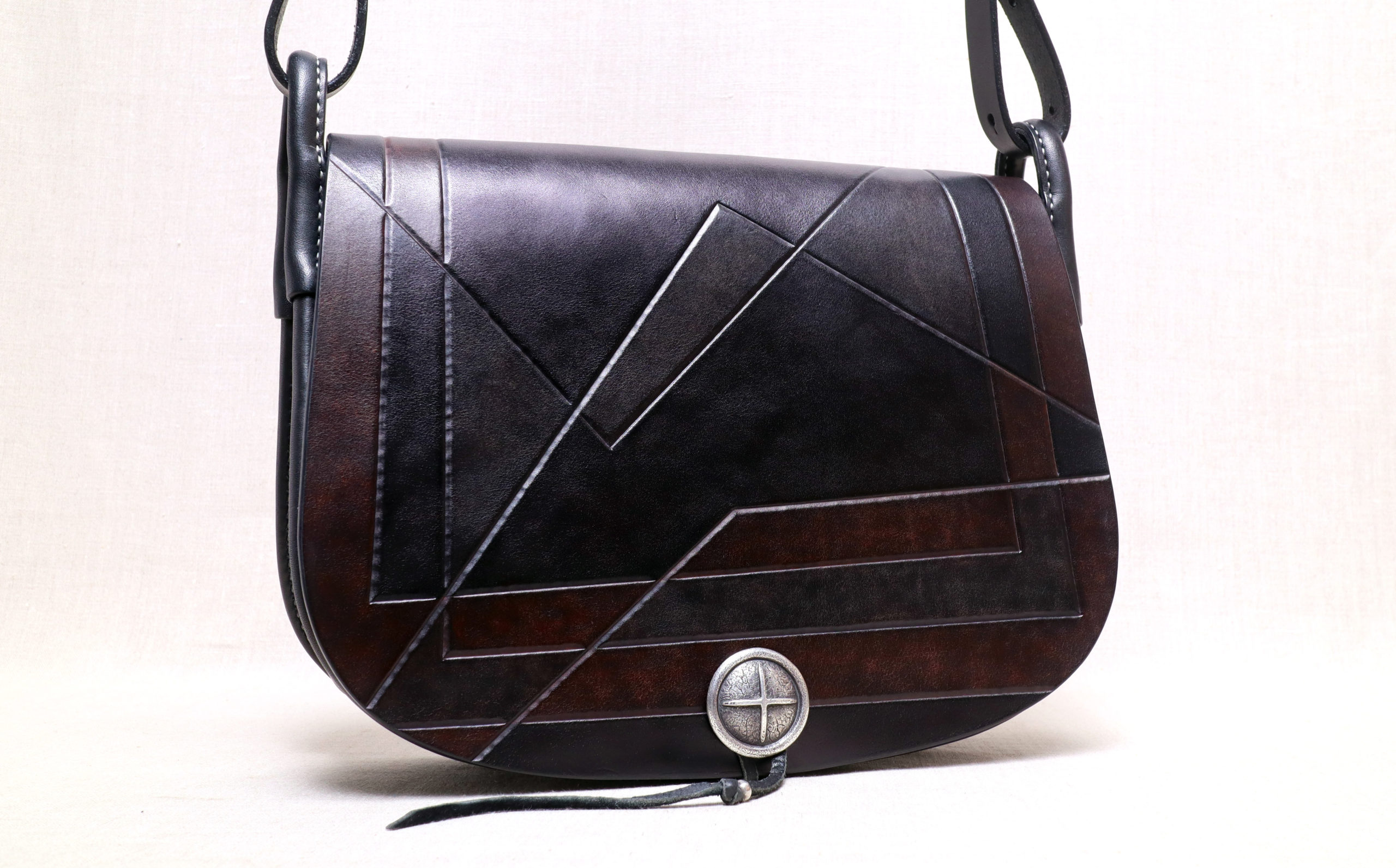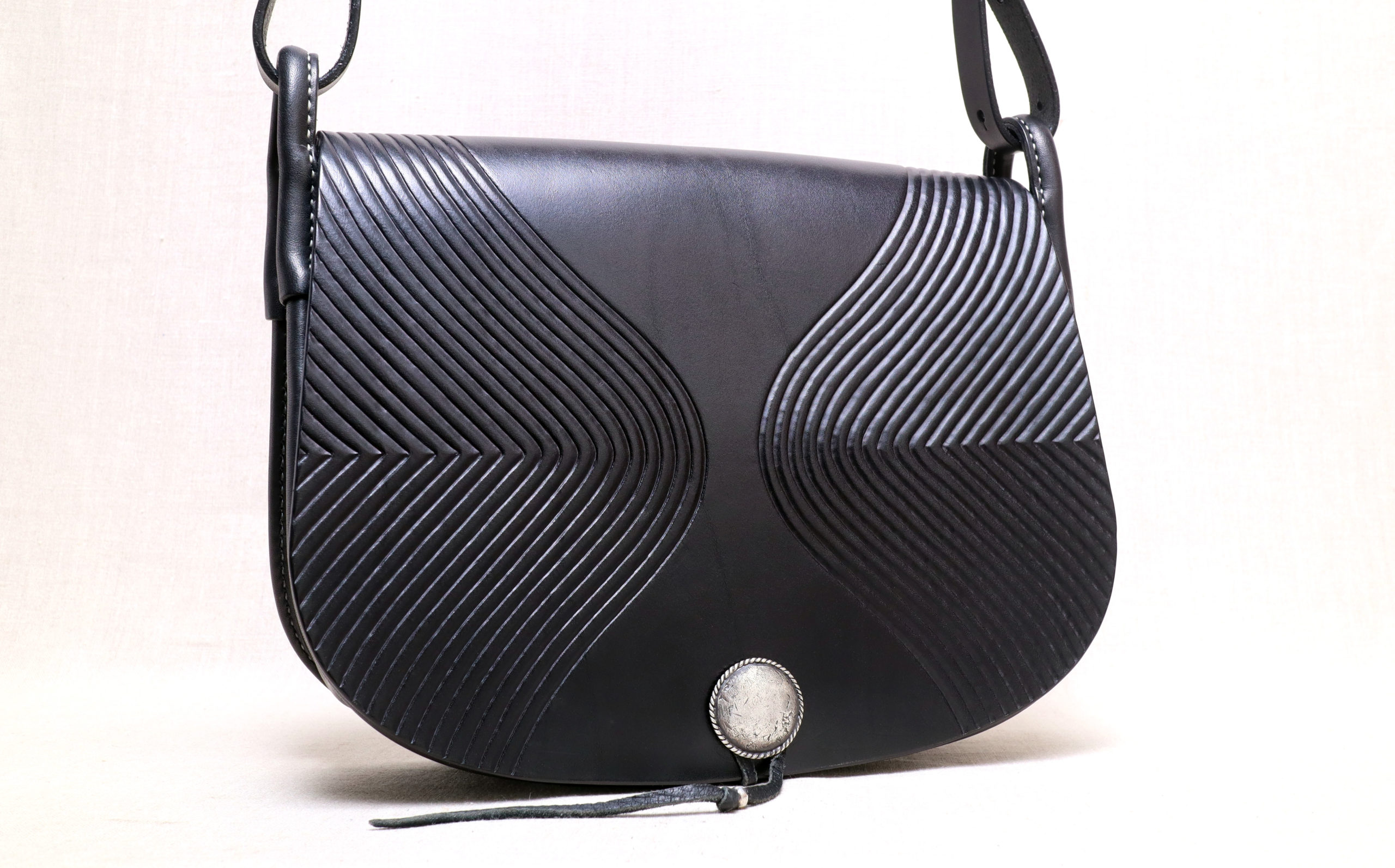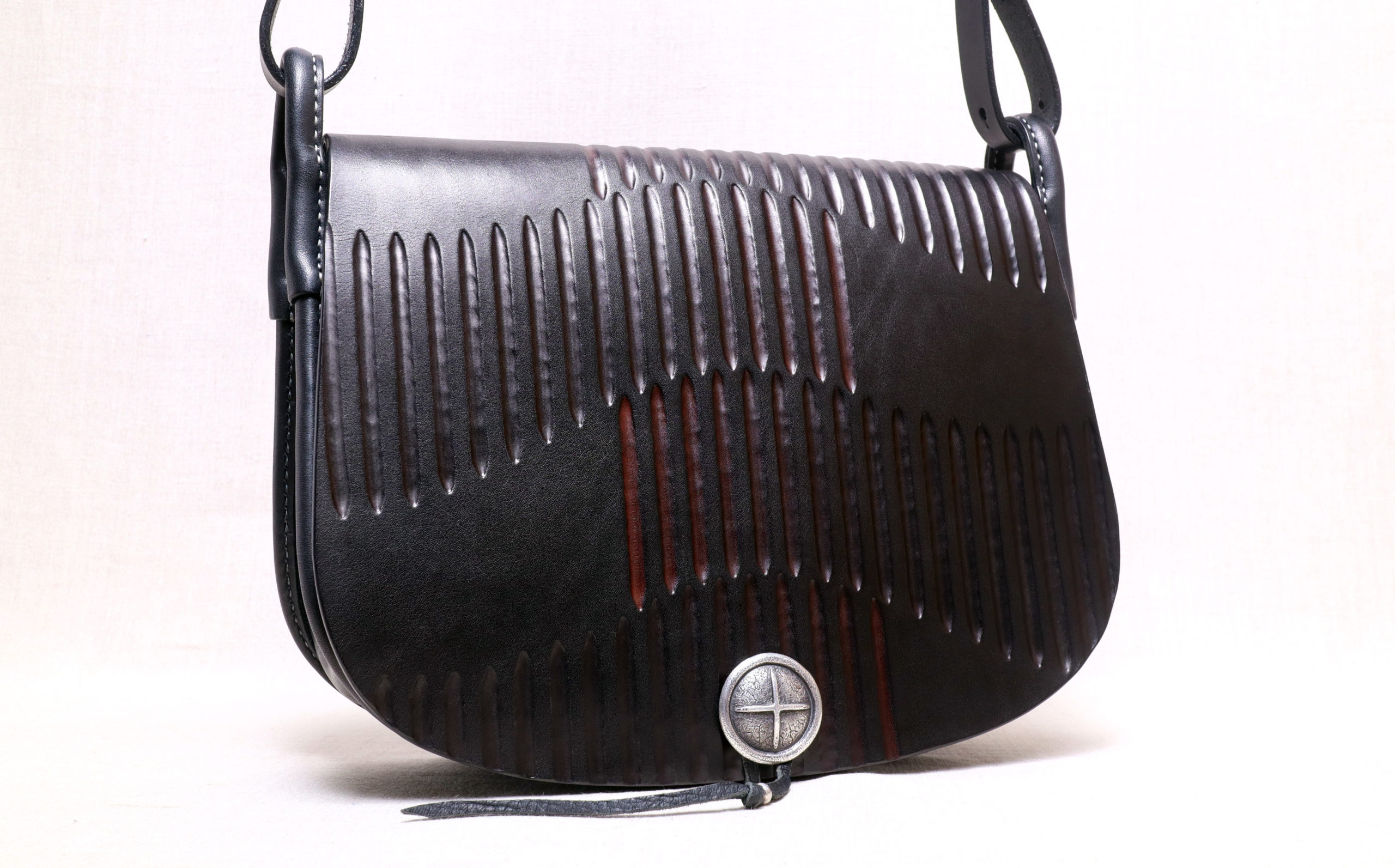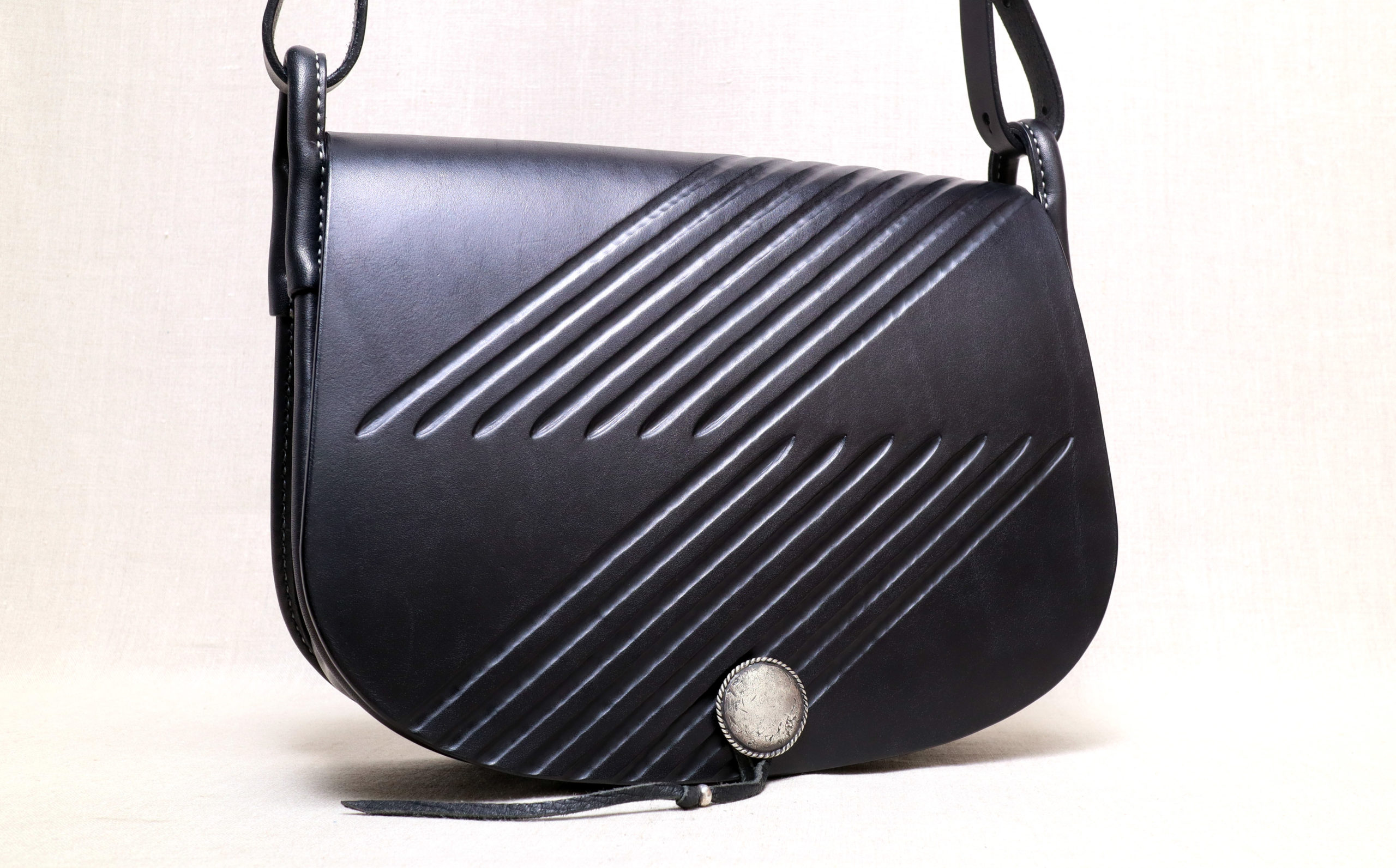私はある年齢に達した時から、パンツやアウターのポケットに物を入れて膨らむのが嫌になり、出掛ける時はバッグが必需品となりました。そしてよく歩き周る。また京都市内の移動手段はほぼ自転車。これらの理由から自然とショルダーバッグ愛好家になり、自分にとっての理想的なショルダーバッグを探究するようになりました。様々な革を使って様々な形状のショルダーバッグをつくり、改良を重ねながら探求を続けていると、自分にとってのショルダーバッグの理想像が見えてきました。それは下記の①と②が両立したショルダーバッグです。